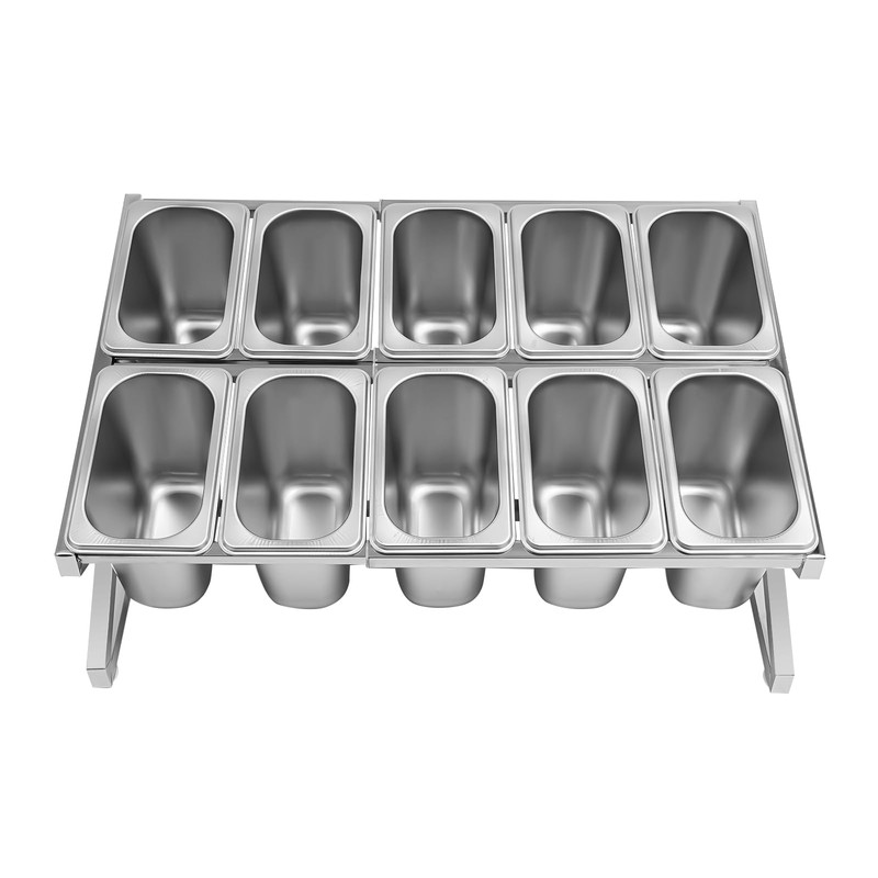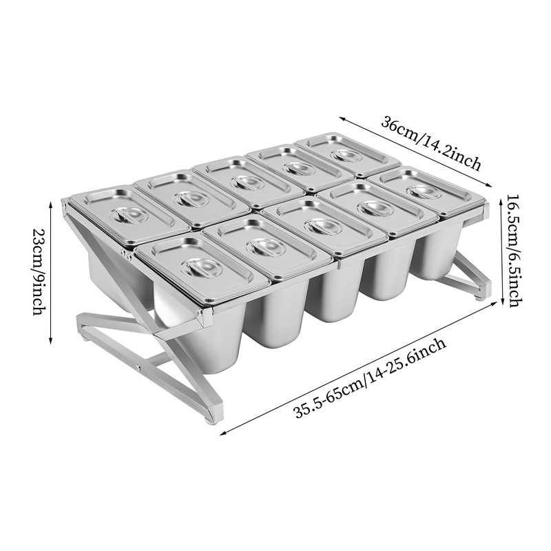 QUEMARQUE Pizza Topping Station - 10 Grids Stainless Steel Spice Racks with Pans and Lids, Inclined Expandable Countertop Dispenser Spice Rack For Seasoning Sauce Salad Jam Ingredients