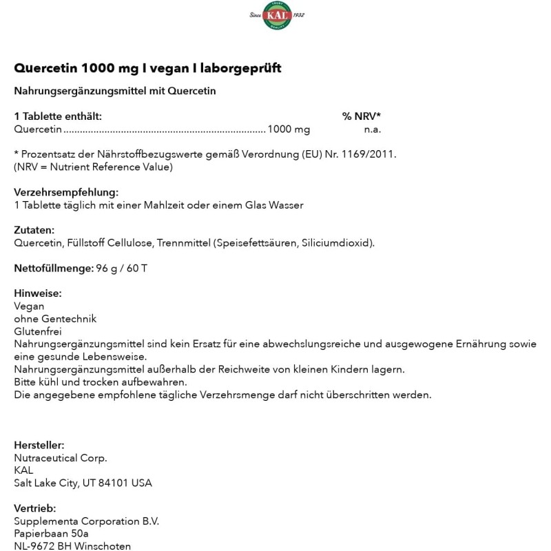 • Quercetin Supplement – A non-citrus bioflavonoid, quercetin is not produced in the body and must be obtained through supplementation or from the diet. KAL Quercetin provides 1000 mg per tablet.