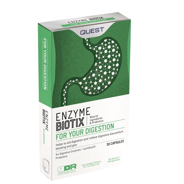Quest Enzyme Biotix is a unique combination of digestive enzymes and probiotics designed specifically for those who have difficulty digesting food. Digestive enzymes help break down food. Enzyme Biotix contains the digestive enzymes papain, bromelain, lipase, amylase, lactase and α-galactosidase. Papain and bromelain contribute to the digestion of proteins, lipase to the digestion of fats and amylase to the digestion of carbohydrates. Lactase breaks down the lactose contained in milk and other dairy products. Α-galactosidase helps to break down more complex carbohydrates, which when not broken down cause bloating and gas.