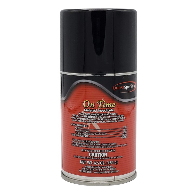DESCRIPTION ON TIME can be used only in commercial food service and preparation areas of milk houses, hospitals, hotels, motels, factories, stores, ships, clubs, restaurants and schools. This blend of natural pyrethrin, piperonyl butoxide and MGK 264 is classified F-1 by the USDA and is effective on flies, mosquitoes and gnats. One can will treat up to 6,000 cubic feet of air space for 30 days, 24 hours a day. APPLICATIONS Great where flies, gnats and mosquitoes are an annoyance, in food service and food preparation areas of restaurants and food processing plants, stores, farms, dairies, barns, kennels, schools, factories, hotels, motels, offices, shops, aircraft cargo hold areas, supermarkets, warehouses, bottling plants, hospitals, and day care centers. Controls flies, gnats, and mosquitos. FEATURES & BENEFITS • Effective formula controls flies, mosquitos, and gnats • Fits most universal dispensers • Long lasting aerosol dispenses 3,000 metered sprays for approximately 30 days of coverage • Automatically dispenses, eliminating waste and misuse • USDA authorized as a pesticide for use in all areas of federally inspected meat and poultry plants