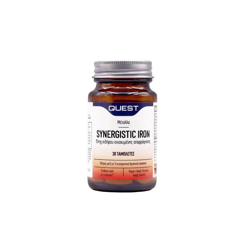 Quest Synergistic Iron provides iron, vitamin C, vitamins B2, niacin, B6, B12, pantothenic acid and folic acid which contribute to the reduction of tiredness and fatigue. Iron plays a role in the transport of vital oxygen around the body and in the formation of red blood cells. Quest Synergistic Iron provides a gentle form of iron combined with amino acids and additional nutrients to aid in its absorption and utilisation in the body.