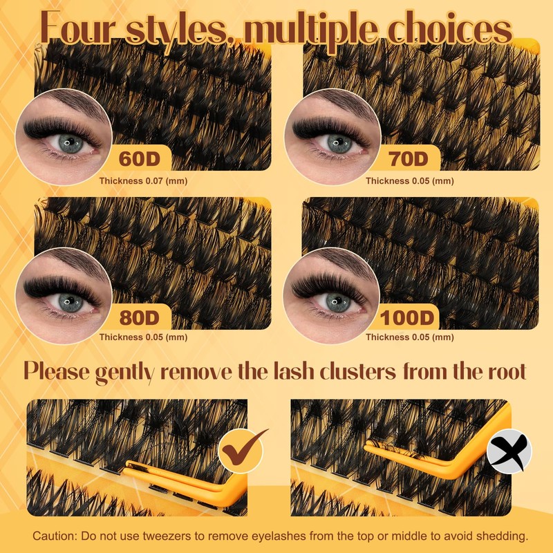 - Mixed Length Combinations: Compared to 30D+40D+50+60D lashes clusters, the 60D+70+80D+100D eyelash clusters give eyelashes an unparalleled sense of fluffiness and density, mix length 12-18mm D curl lash clusters. You can compare different DIY lash extension styles to test the right lash clusters for you. The lash clusters natural matte effect makes wearing more natural. You can also create natural eyes, cat eyes, or doll eyes. Making your eyes look fuller and more attractive.
