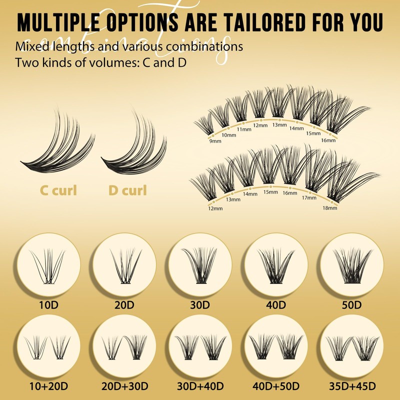 • 【320pcs Extra Large Lash Clusters Tray】320PCS cluster lashes, super affordable! We offer various options of eyelash clusters lengths: one ranges from 9mm to 16mm, or you can choose to mix 12-18mm, curls include C and D, and there are also have 10D,20D,30D,40D,50D,10D+20D, 20D+30D, 30D+40D, 40D+50D. A variety of styles can give you a better choice.