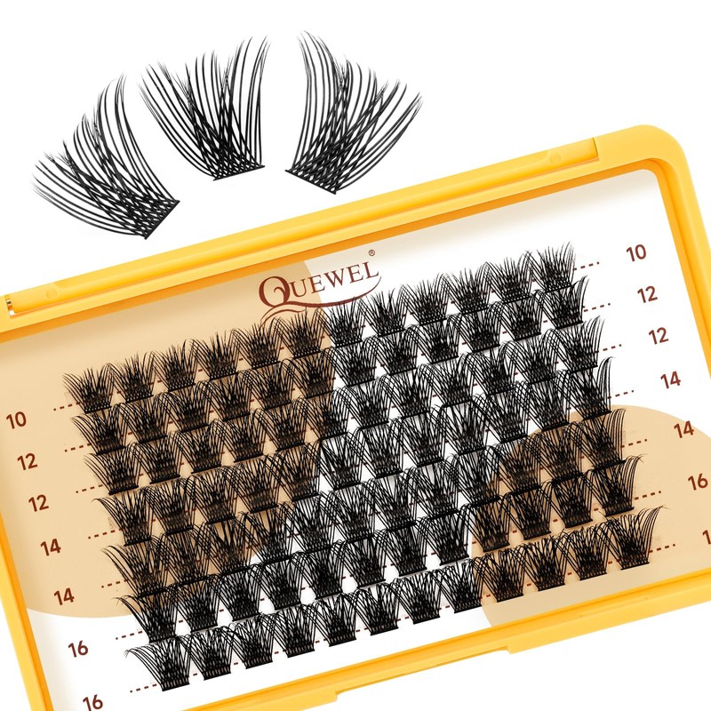 - đ· ăSpecificationăQUEWEL new lash clusters, D curl, mixed eyelash clusters tray 10-16mm(10mm*1 line, 12mm*2 line, 14mm*2 line, 16mm*2 line), 7 rows, 12pcs per row. Yellow frosted box, with a stronger sense of luxury and texture. Cluster lashes packaging box is not easy to break, easy to carry when going out, and can be used on kinds occasions.