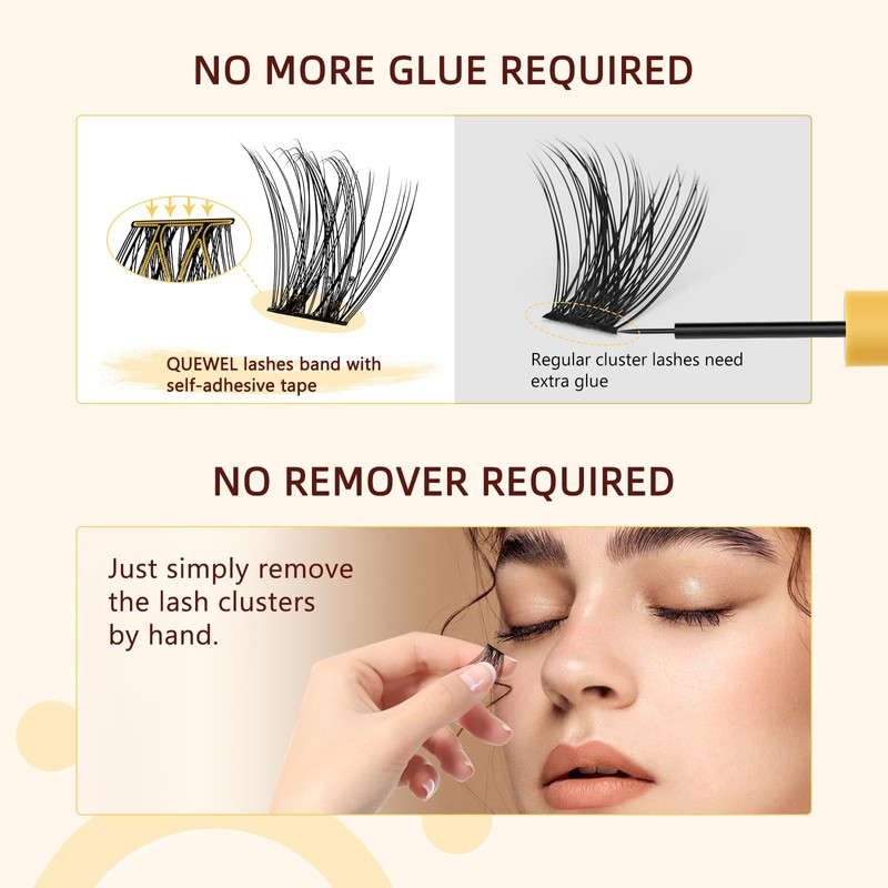 - 【Premium Material and Quality】QUEWEL eyelash clusters are made of high-quality materials and are comfortable to wear, our lash clusters band is made from a thin band, softer, stronger, and thinner. Beginners can easily complete it in 5 seconds. QUEWEL's self-adhesive eyelashes kit will give you a delightful shopping experience.