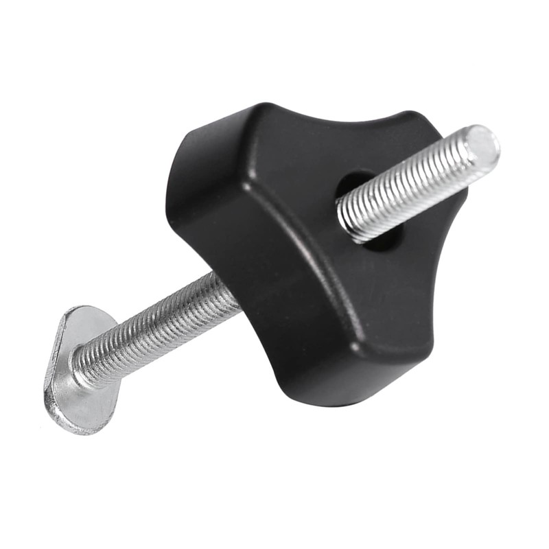 Quickly slides into the T-rail and secures by turning the hand knob nut.