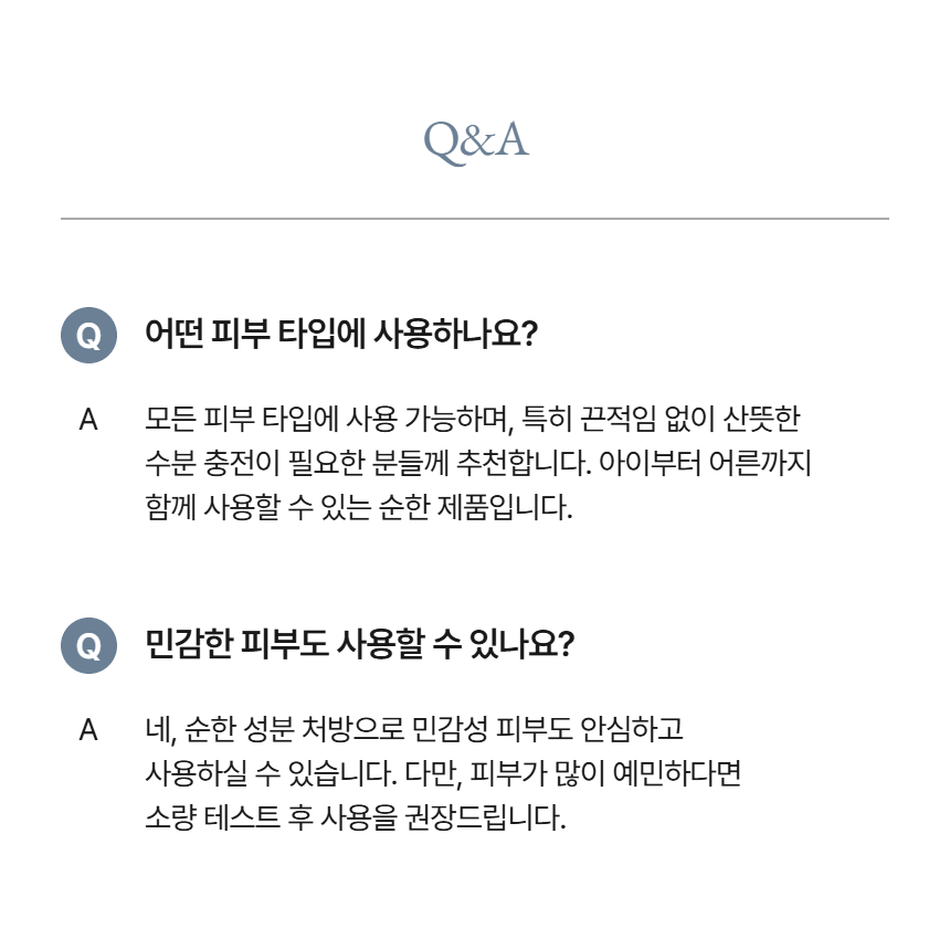 민감성 피부도 사용할 수 있도록 가벼운 사용감과 부드러운 마무리감이 장점이에요.