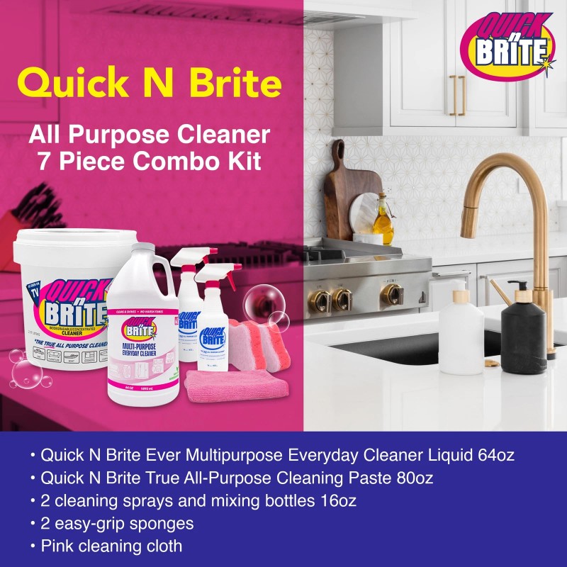 Effortlessness and Versatility Personified in CleaningThe Quick N Brite All Purpose Cleaner Combo Kit is a reliable partner that transforms your regular cleaning routine and immediately brings the multipurpose cleaner magic into your hands. Whether acting as a powerful kitchen degreaser, an effective tile scrubber, a surface polisher, or an efficient bathtub and carpet cleaner, this combination emerges victorious in every cleaning scenario through our trusted concentrated formula.Amplified All Purpose Cleaning Solution in a BundleMeticulously picked for its efficiency, the Quick N Brite All Purpose Cleaner Combo Kit consists of the Multipurpose Everyday Cleaner Liquid (64 oz), and the True All-Purpose Cleaning Paste (84 oz). Also included are 2 easy-grip sponges and two mixing bottles for effortless, precise cleaning. Packaged in a compact design measuring 8 x 7 x 11.13 inches and weighing 8.4 lbs., this all purpose cleaner kit is ready to enter your home and brighten it up from the inside.Multipurpose, multi-surface cleanerQuick N Brite's cleaning bundle is crafted to serve all corners of your home. With just the right amount of cleaning solution, you'll make the most out of our bundle's cleaning powers as a grease remover, floor scrubber, and even a cleanser for any surface, including marble and granite, and even hardwood floors. For best results, only use a light solution (¼ shot or 1oz per gallon) in spraying off dirt on windows, mirrors, glass, aluminum, chrome, stainless steel, and more, while a heavy solution (a full solution or 6oz per gallon) is useful in wiping off tough stains in carpets, bathrooms, kitchens, pieces of clothing, cabinets, fireplaces, and pet stains. Our very own cleaning sponge will also assist you in wiping off dirt.