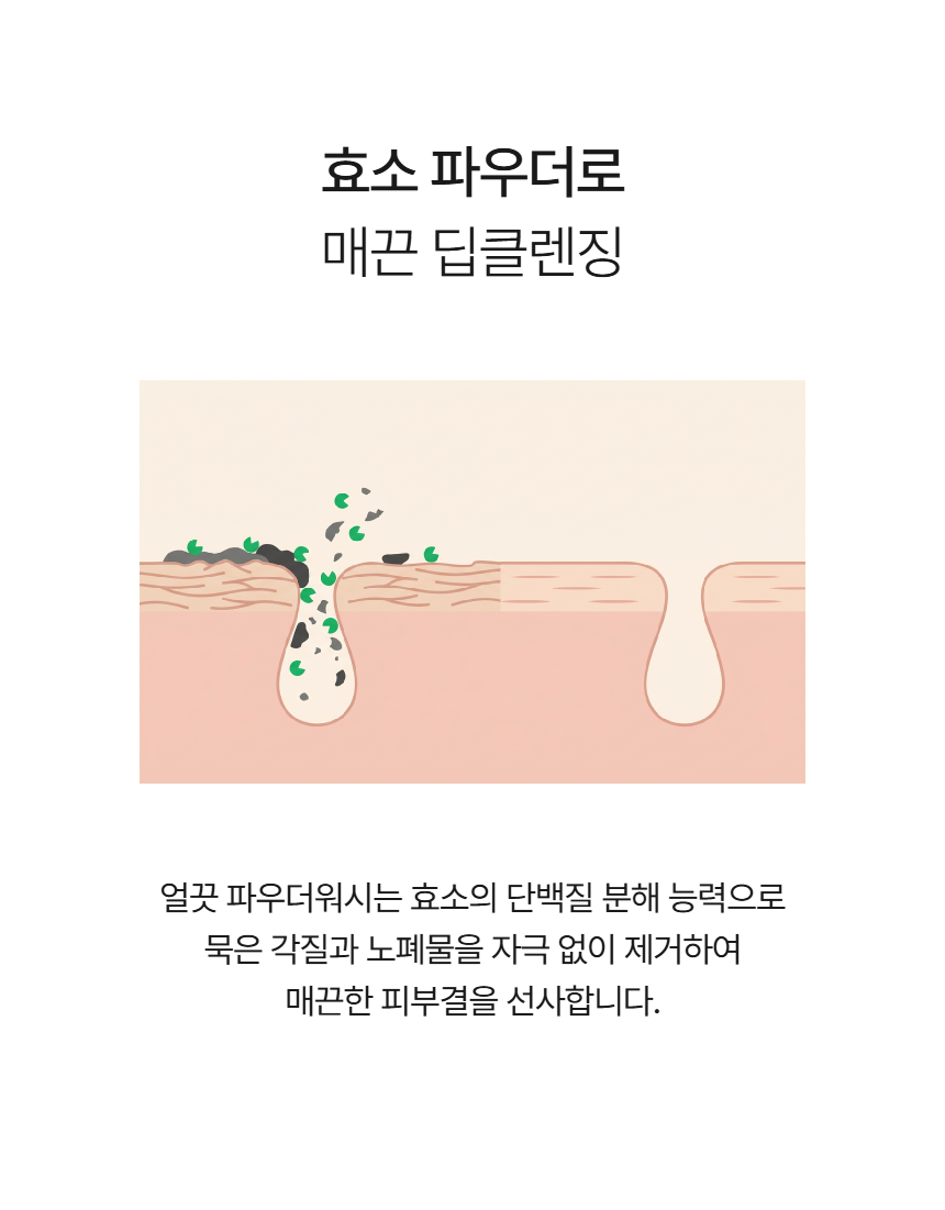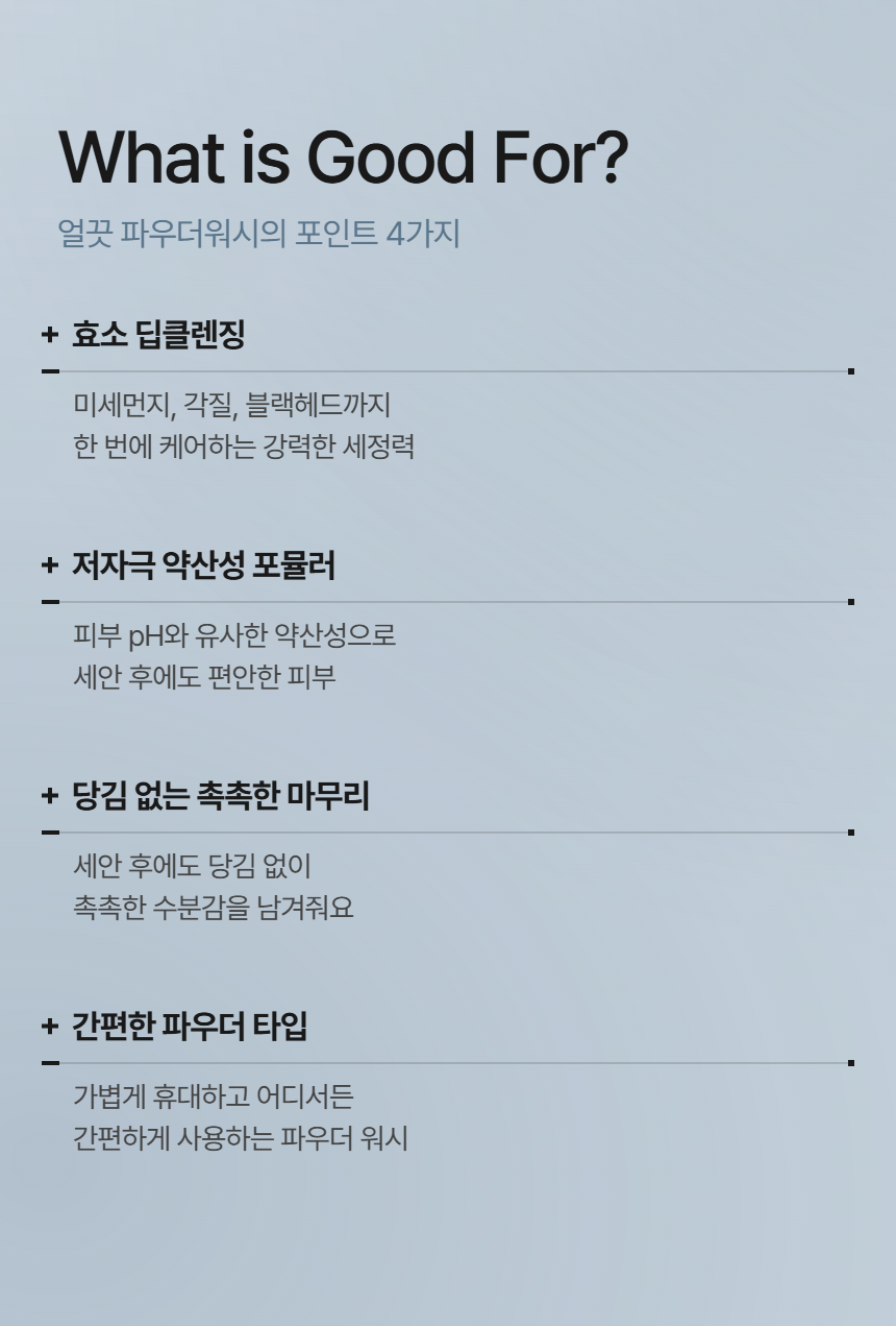 얼끗 파우더워시는 부드러운 세정력으로 민감한 날에도 편안하게 사용할 수 있는 데일리 저자극 파우더워시입니다.
