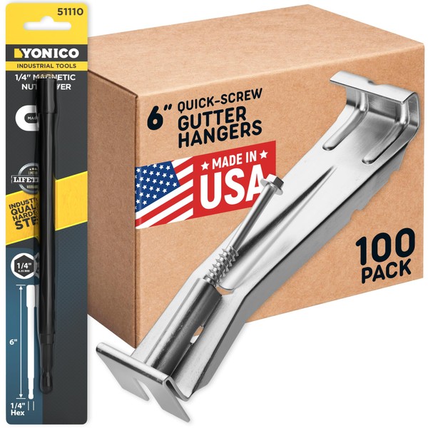 Quick Screw 6 Inch Gutter Hangers - 100 Pack - Gutter Brackets 6 Inch with Bonus 6 Inch Drill Bit - Hidden Bracket Clips with Pre-Assembled Screw - Fix Sagging Rain Gutters