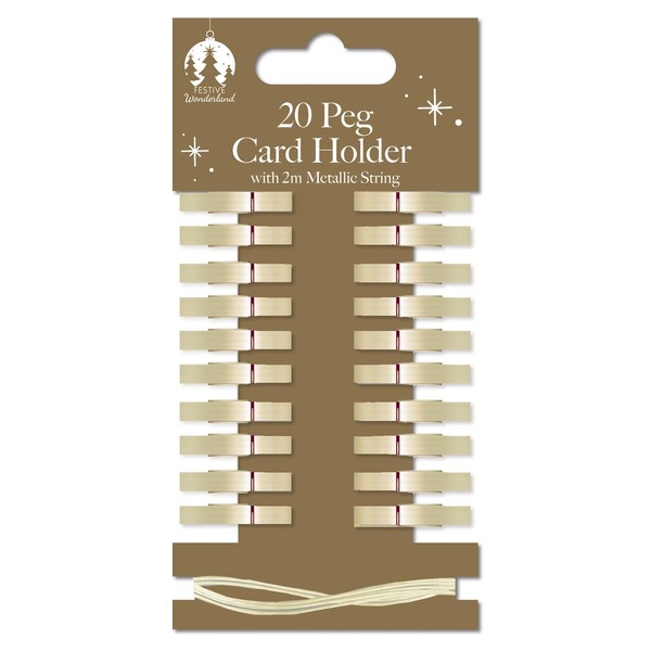 Quickdraw 20 Wooden Peg Christmas Card Holders with Metallic String Festive Card Display Decoration (Gold)