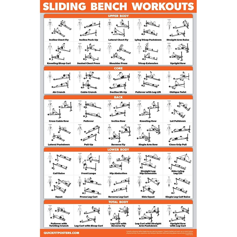 QUICKFIT Sliding Bench Workout Poster - Compatible with Total Gym, Weider Ultimate Body Works - Incline Bench Exercise Chart (LAMINATED, 18" x 24")