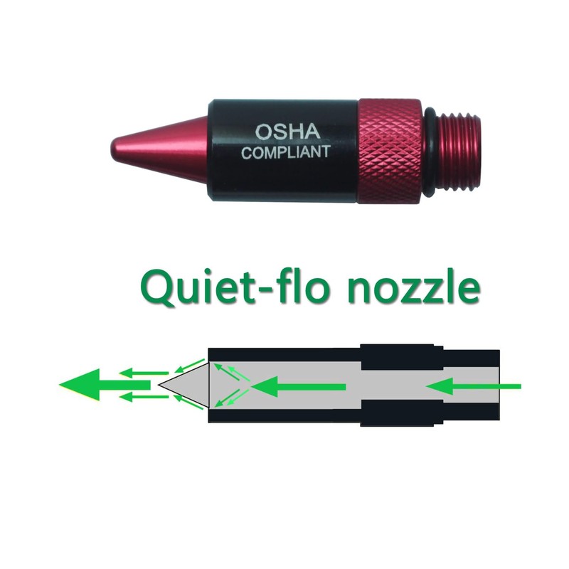 - There are Quiet-Flo nozzle, Safety nozzle and Tri-Thrust nozzle in this kit. The Quiet-Flo nozzle can maximize air flow and reduce noise-inducing turbulence. For the Xtreme-Flo nozzle, the main air flow could boost the thrust up by drawing in surrounding air through the two side ports to clean large workshop areas. The Tri-Thrust nozzle has triple thrust to boost the main air flow. Nozzle to have 92 SCFM AT 90 PSI.