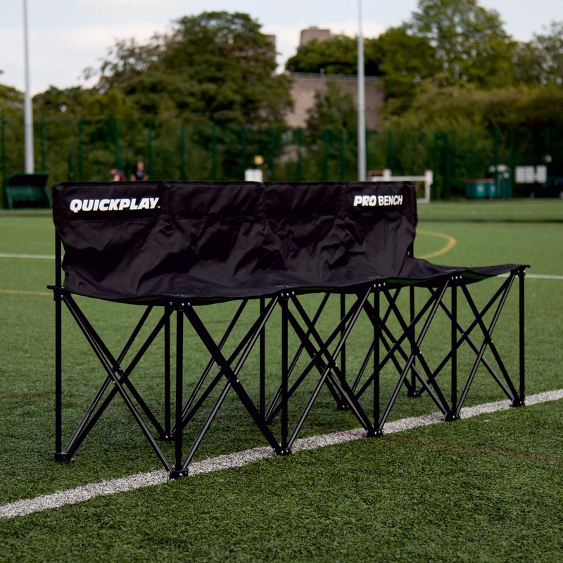 Introducing the QUICKPLAY PRO Portable Folding Bench with new 2019 design - features a fast set-up folding steel frame, high quality durable fabric and comfortable high back rest. The bench comes with its own bag for easy transportation and storage. No instructions or assembly is required. VERSATILE- The QUICKPLAY PRO Bench is the ideal portable seating solution for sports teams or tournament spectators. It's so versatile you'll use it again and again on camping trips, extra seating at parties, tailgating, etc. HEAVY DUTY - This bench has been specifically designed with vertical support steel poles to provide added stability, an important feature missing from many other cheaper portable benches. Each seat holds up to 250 lbs, making the QUICKPLAY PRO bench suitable for both kids and adults to use. AVAILABLE IN 3 SIZES 4, 6 & 9 Seats. Each seat is 17 inches wide, with a 11.5 inch high seat backs for added comfort. The 4 seat bench weights 18lbs, 6 seat bench weighs 25lbs & the 9 seat bench weights 32 lbs. 2 YEAR PARTS WARRANTY - When buying 'New' direct from QUICKPLAY (seller) you will receive our 2yr parts warranty, from a company that prides itself on customer service. Designed in the UK by soccer players, for soccer players and used by professional soccer clubs, schools and colleges around the world.