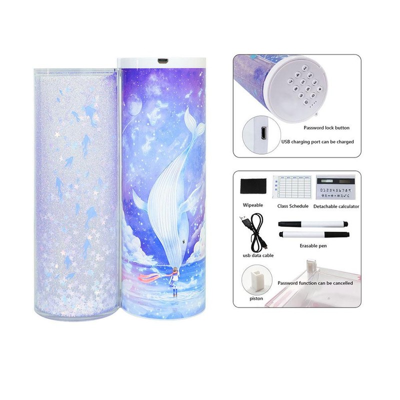 1、Pencil case with lock, using charging lock and double opening independent space design, there is more storage space to better store and keep your stationery. 2、Multi kinetic pencil box. This quicksand combination lock pencil box is equipped with a calculator, a small mirror, an erasable plate, and a magnetic box clasp. 3、It is easy to use and has many functions. At the same time, the electronic password lock and calculator can be removed to allow Your password locked pencil case becomes an ordinary non locking pencil case. 4、Durable material, made of all ABS materials, it can provide excellent against dust, scratches and abrasion, and is easy to clean. With a strong magnetic box clasp, the pencil case is easy to open and close. 5、Exquisite appearance, unique quicksand design, swinging the pencil box up and down, the quicksand can up and down together, very beautiful, can better attract the attention of children, making your child s pencil box the most unique existence in the class.