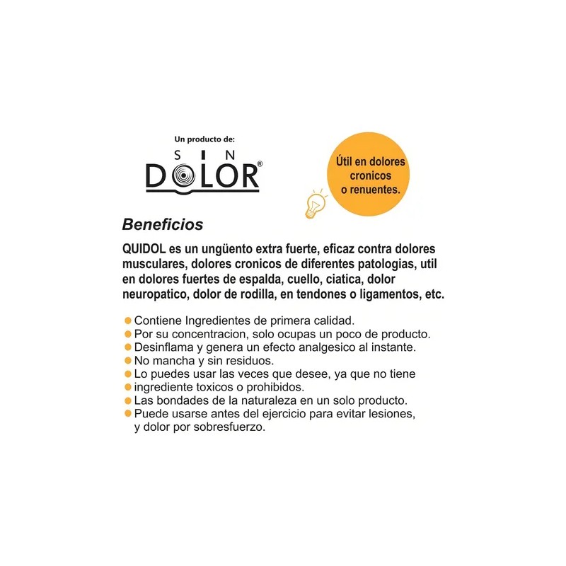 QUIDOL es un ungüento extra fuerte diseñado para combatir dolores musculares y crónicos de diversas patologías. Es efectivo en casos de dolor intenso de espalda, cuello, ciática, neuropático, de rodilla, así como en tendones o ligamentos.