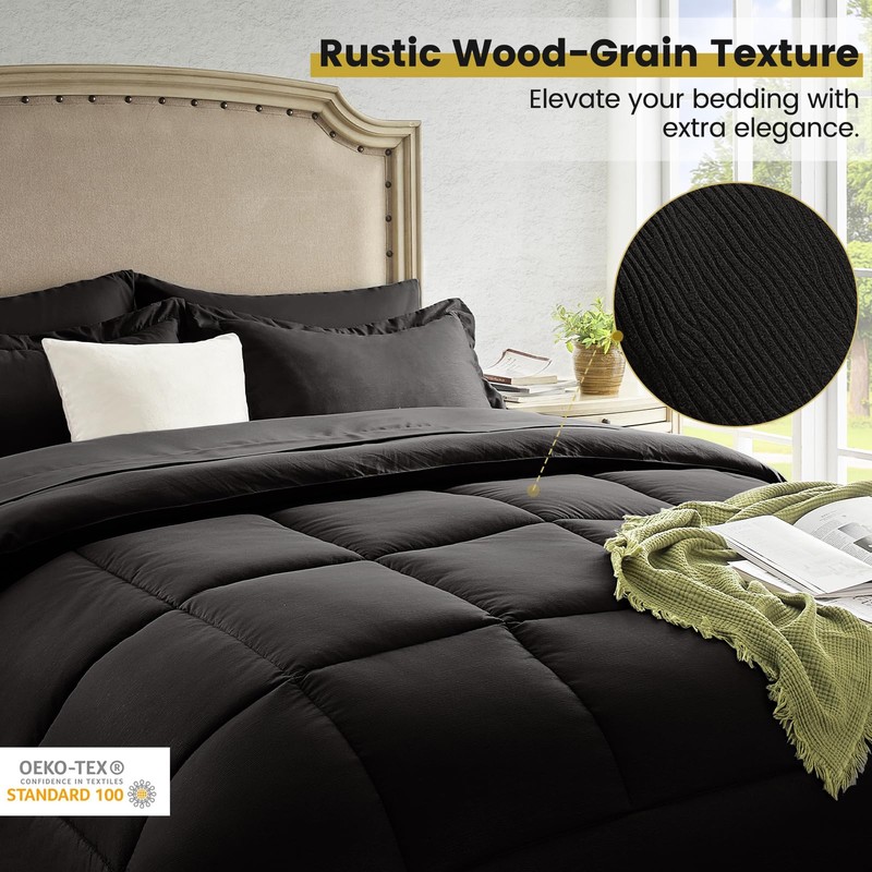 - 【All-Season Comfort】 This black queen comforter set is a versatile choice for all seasons. Our comforter is filled 15% more than others, and the whole-piece polyfill offers cloud-like lightness and exceptional temperature control. Whether in winter or summer, our bedding comforter sets ensure your comfort year-round. Sleep soundly with our vintage queen bed in a bag.