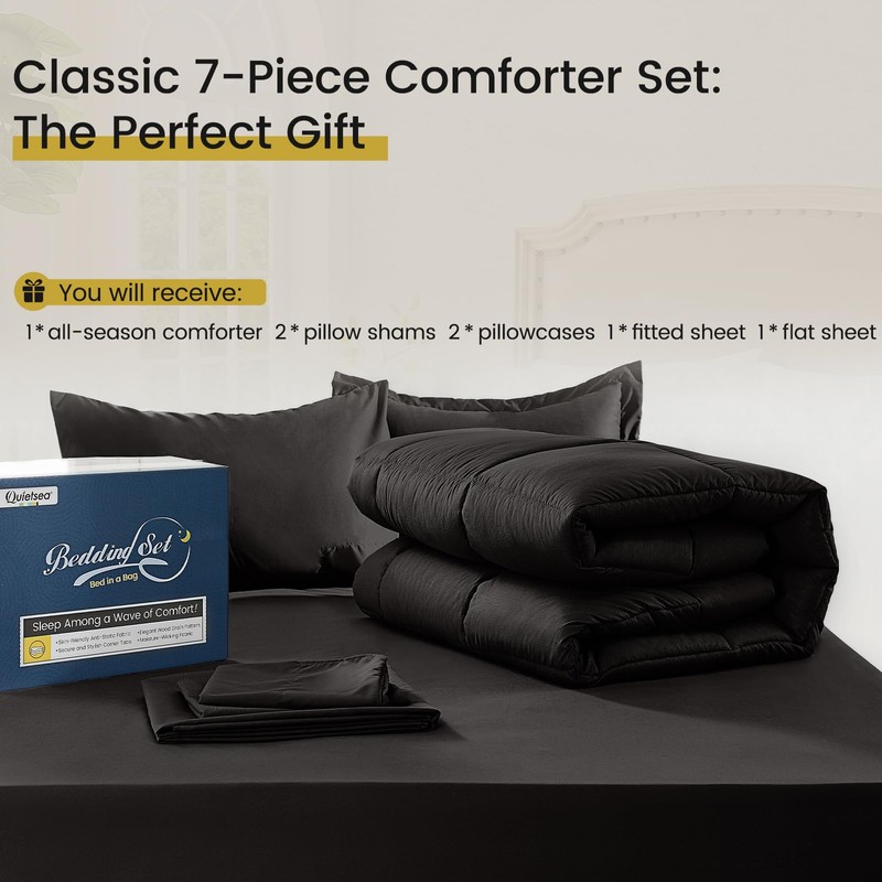 QUIETSEA Queen Bed in a Bag 7 Pieces Comforter Set Queen, Wood Grain Texture Comforter Set Black Bed Set with Comforter, Pillowcases, Flat Sheet, Fitted Sheet and Pillow Shams