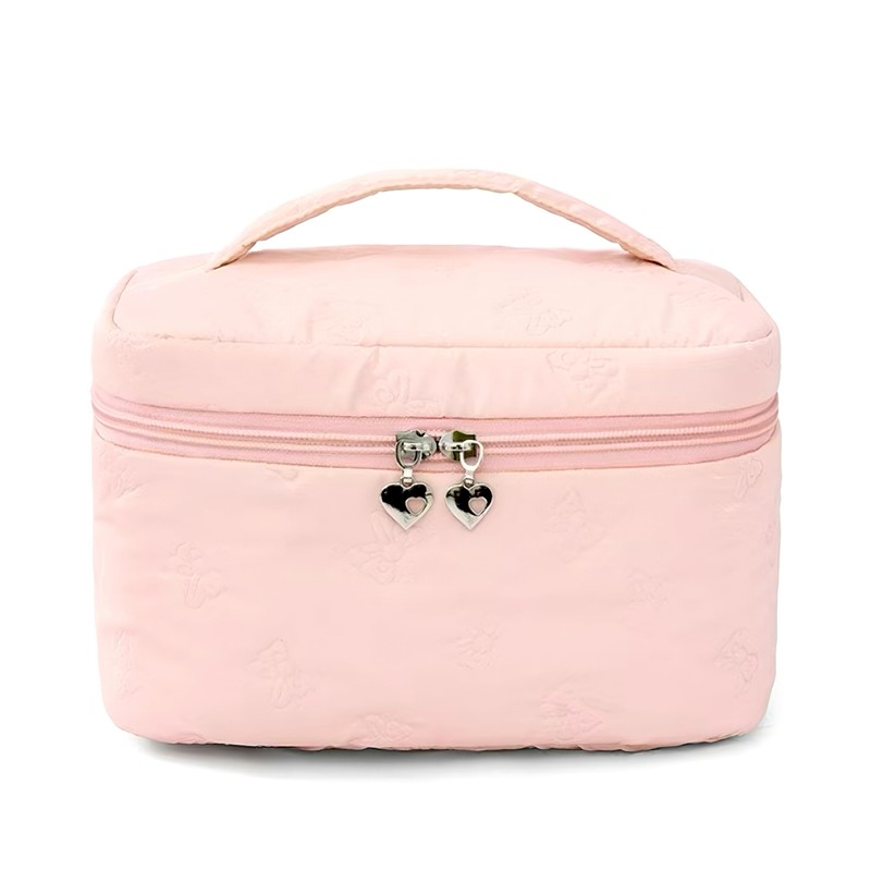 Quilted Cosmetic Travel Case, Pink Makeup Bag with Heart Charm Zipper, Soft Portable Toiletry Organizer
