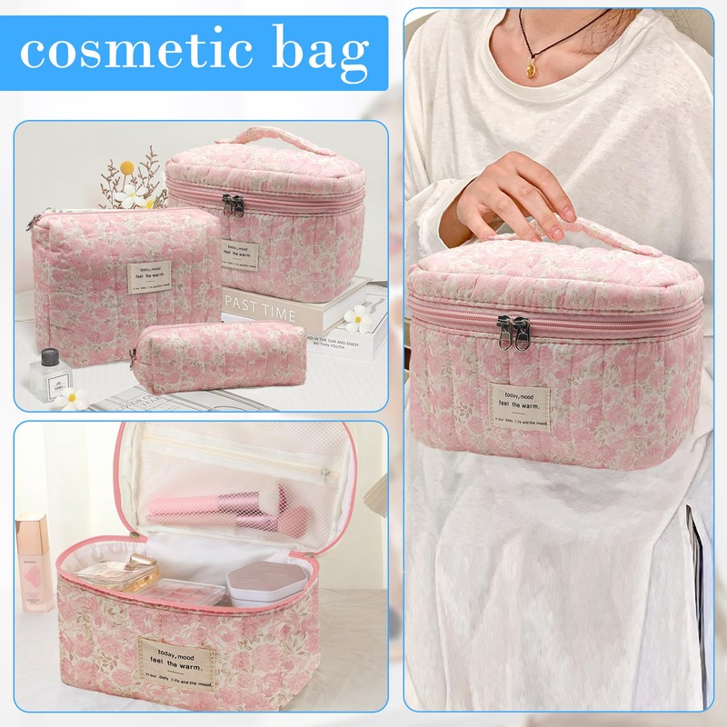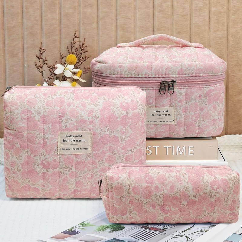 Quilted Makeup Bag, Large Capacity Travel Cosmetic Bag for Women and Girls, Aesthetic Storage for Daily and Travel Use (3pcs-Pinkditsyfloral)