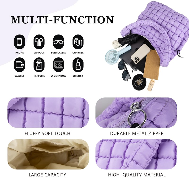 Quilted Puffer Tote Bag Large Crossbody Shoulder Bag with Zipper, Nylon Bubble Hobo Handbag Carryall Bag for Women, Purple, Large, Contemporary
