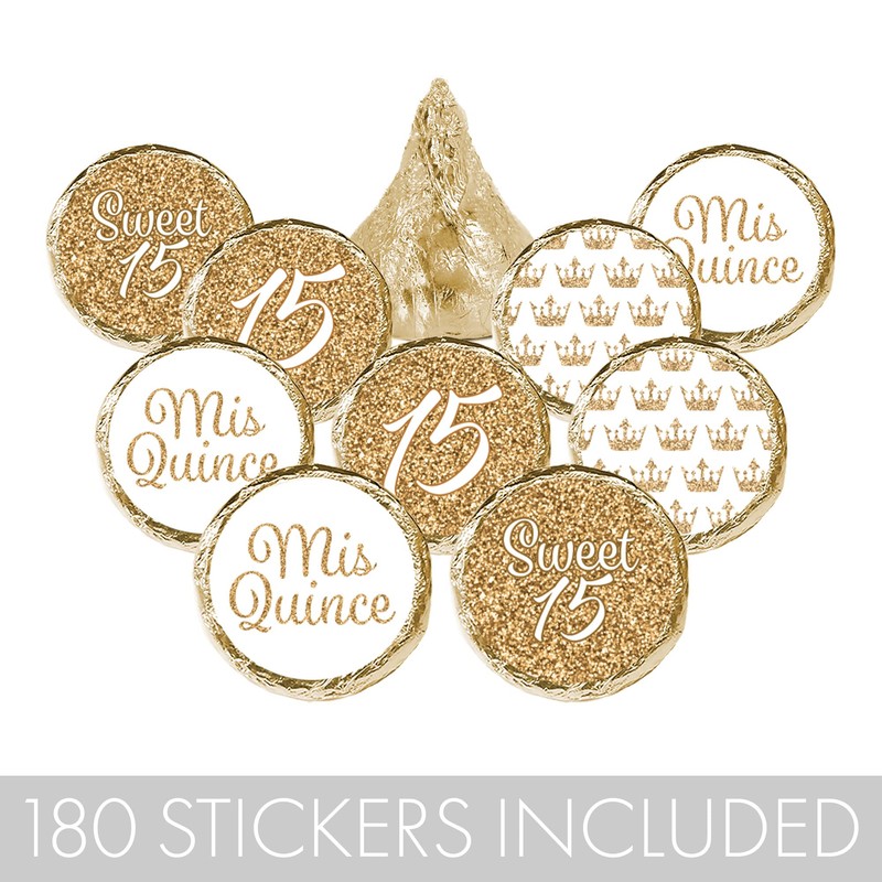 - Use the exclusively designed DISTINCTIVS Gold Mis Quince candy stickers for 15th birthday party favors.