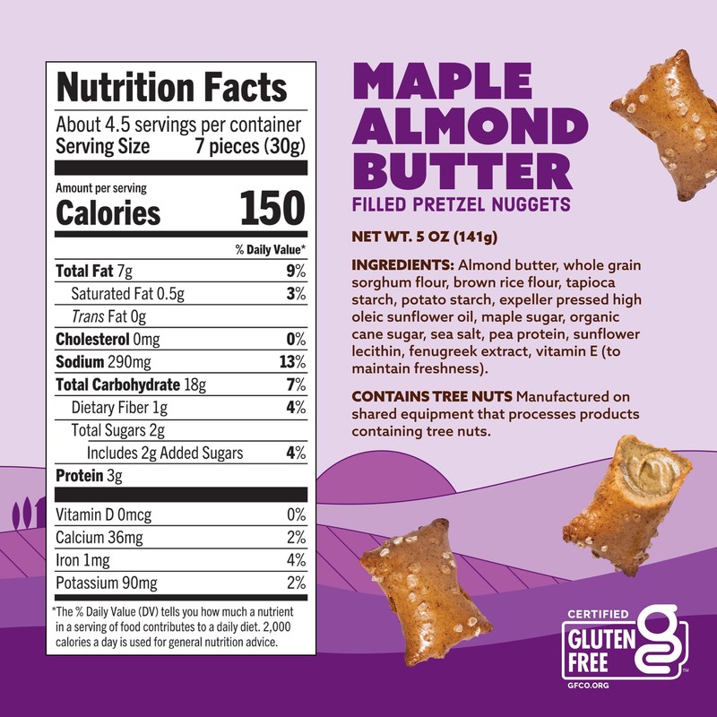 - Maple Almond filled pretzel Nugget: the first ever gluten Free and peanut free Almond butter Filled pretzel, these pretzel nuggets have just the right amount of creamy almond butter and a hint of maple sugar to top it off.