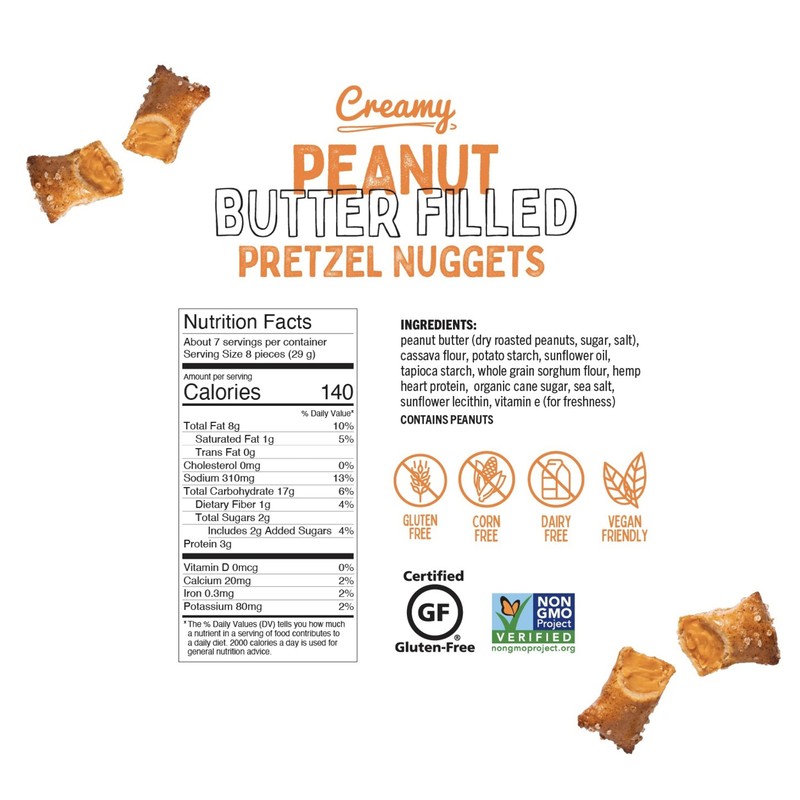 - PEANUT BUTTER LOVERS REJOICE: Introducing the first gluten-free, whole grain peanut butter filled pretzel. Just the right ratio of Peanut butter to pretzel with a creamy and crunchy texture. This bite-size treat is deliciously addictive.