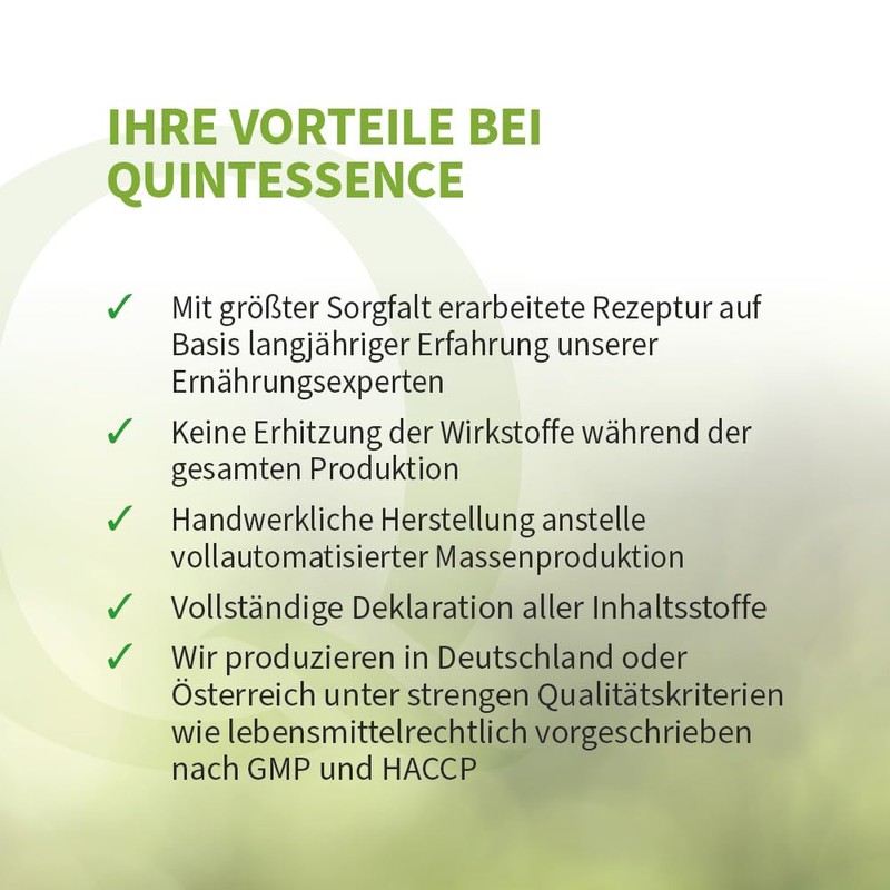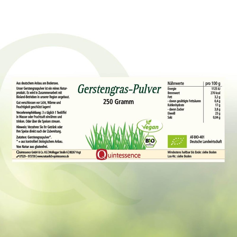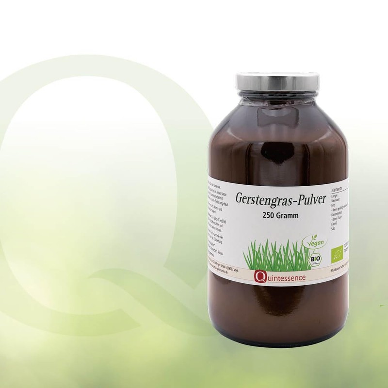 - Quality from Germany: The barley grass from Quintessence is grown under the highest quality standards on organic fields in the Lake Constance region. They are far away from traffic roads and are surrounded by other ecologically working farms. So your body benefits from the pure power of nature.
