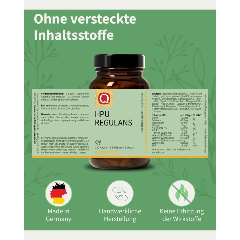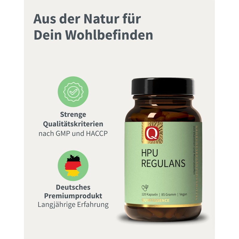 - QUALIT?T AUS DEUTSCHLAND: Die HPU Regulans Kapseln werden unter h?chsten Qualit?tsstandards sorgf?ltig in Deutschland hergestellt. Die Wirkstoffe werden w?hrend der gesamten Produktion nicht erhitzt. Die Abfllung erfolgt nur nur in ungef?rbte Kapselhllen pflanzlichen Ursprungs. Die Herstellung erfolgt handwerklich anstelle vollautomatisierter Massenproduktion. In der Summe wird dadurch optimale Qualit?t erzielt.