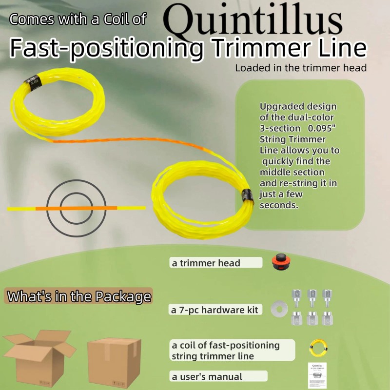 Comes with a coil of 14Ft 0.095" fast-positioning string trimmer line. The precision dual color 3-section design of 095 trimmer line heavy duty allows you to quickly find the middle section, optimizing the experience of easier & faster loading and premium Nylon material extended usage over long grass, weeds, and tough terrain.