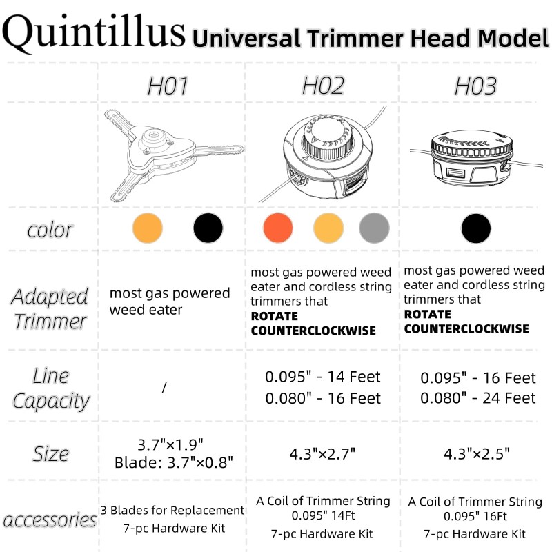 Simplify your lawn care routine with H02 weed wacker head, designed for hassle-free installation and exceptional performance.  Compatible with nearly all counterclockwise-rotating grass trimmers, H02 weed wacker head is a versatile solution for a wide range of machines.  Crafted from premium materials, the head body is made from a finely tuned blend of nylon and fiberglass, ensuring durability and resistance to wear and tear.  Paired with 100% high-quality nylon trimmer line, H02 string trimmer head delivers clean, precise cuts through grass, weeds, and light brush.  Its user-friendly design allows for quick and effortless reloading, saving you time and effort.  Whether you're a homeowner or a professional landscaper, H02 weedeater head is a reliable choice for maintaining a well-groomed lawn with minimal downtime.