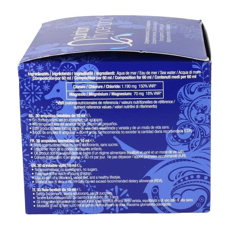 - Supports bone and dental health, as well as protein synthesis and psychological function. Ingredients: Seawater: 100%. No preservatives, no sweeteners, and no added sugars.