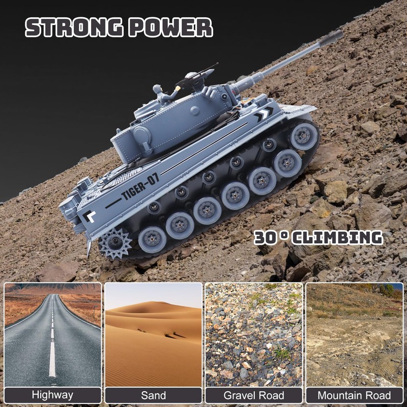 This Tiger tank is a real tank, he has all the functions of a real tank, 1/18 large size makes the tank very cool, powerful engine allows the tank to adapt to a variety of terrain, 48 ° climbing powerful off-road capabilities, the tank's turret can be rotated 350 ° through the remote control, the barrel can be lifted up and down, the 2.4GHZ frequency can be realized by up to 50 meters of remote control distance, the tank's turret can be rotated 350 ° through the remote control. The tank has a simulation of the sound of real tanks, while operating the tank to launch the shells also have the sound of launching, this tank can launch B-B. 7-8MM. this tank has two motors, three gears of different acceleration, speed can be adjusted through the throttle.The tank uses high capacity battery, one battery can last 40 minutes.