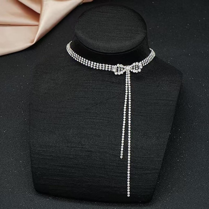 • 1.For unique and stylish designs, discover our amazing silver rhinestone bow tassel necklace, designed for women who love fashion. Featuring a long shimmering cz ribbon bow, this tennis necklace offers a minimalist yet vintage look that's great for a lively dance party, bar, or any special occasion. Its exquisite design makes you stand out from the crowd