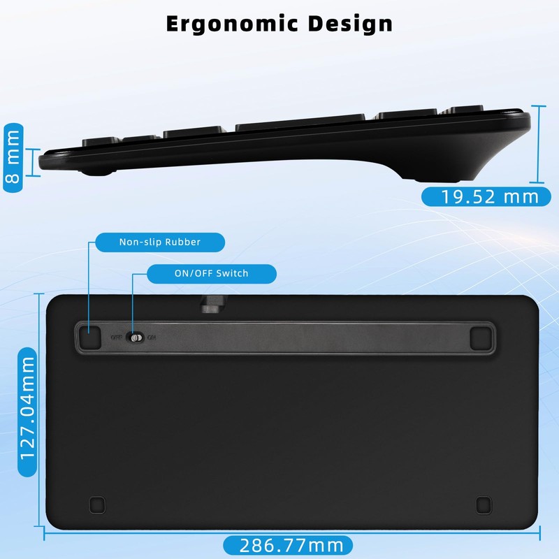 • USB-C Charge&LONG Battery Life : The Keyboard stays powered for up to 50 days(2 hours per day) on a full charge and charges quickly with the included USB-C charging cable for about 3 hours. Featured power-saving takes the keyboard to sleep after 30 minutes of inactivity. The auto-sleep technology, on/off button(on the back of the keyboard) and the battery indicator light help to save more power.