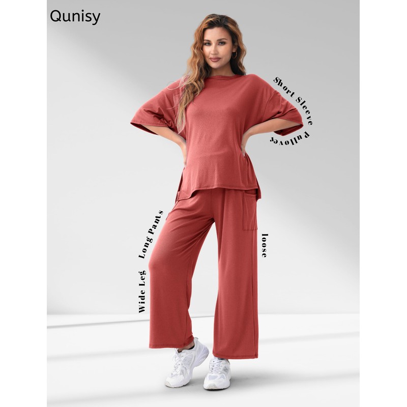 - 2 PIECE MATERNITY SET: QUNISY Maternity Lounge Set include a loose short sleeve pullover top and adjustable wide leg pants, made from soft, breathable and stretchy ribbed fabric. Two piece matching sets is a chic outfit for lady and new mom.
