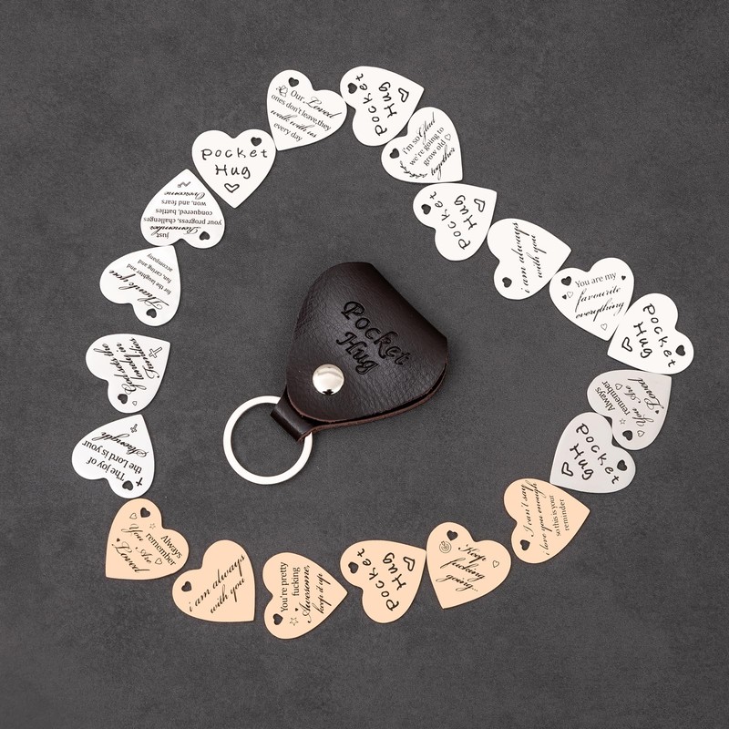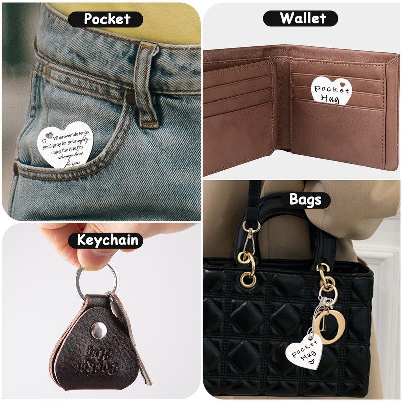 - 【What You Will Get】You will get 1pcs 2.6x2.7cm Stainless Steel Small Pocket Hug Token,double-sided designs and it is printed with different heartwarming sentences.1pcs Leather Storage Token Keychain.