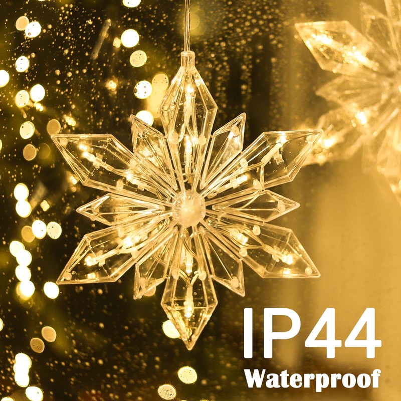 - SIMPLE TO INSTALL AND HANG IN ANYWHERE: Provided with 4 clear adhesive hooks(installed on a clean and seamless surface), these fairy star string lights allow you to hang the 3-snowflakes lights and also hang the battery box separately, preventing falling with strong concealment. The window star lights' battery box is designed with excellent performance with an IP44 waterproof rate, which means that even on little rainy days, snowflakes can flash outdoors, very convenient and safe to place anywhere.