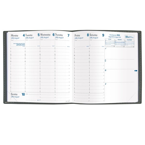 - EXECUTIVE WEEKLY PLANNER - Improved time management is simple and clear with detailed hourly planning for each day on a weekly 2-page layout. This square format productivity planner with priority boxes, 90g ultra smooth paper, tear-off corners, note blocks for business journaling, and three mini month calendars at each week keeps your schedule on track and project planning on course. Vegan covers in multiple colors help express your ideas in creative style.