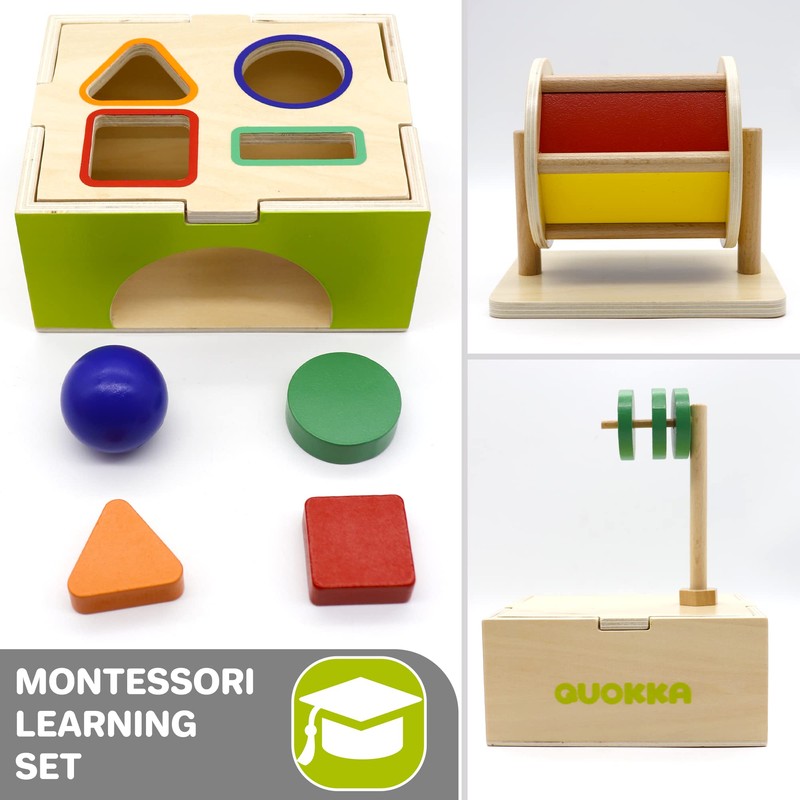Quokka Montessori Toys for Babies 12 Months - Shape Sorter Toys for Toddlers 1 2 3 Year Old | Rainbow Spinning Drum | Sorting Cube | Discs on Dowel | Wooden Learning Activity Cube