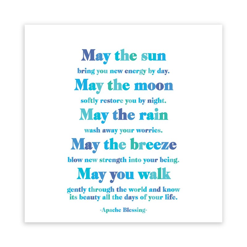 - Features the Apache blessing “May the sun bring you new energy by day, may the moon softly restore you by night, may the rain wash away your worries, may the breeze blow new strength into your being. may you walk gently through the world and know its beauty all the days of your life.”