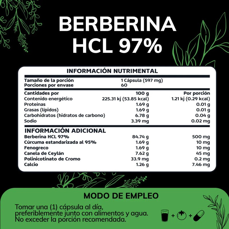 Berberina HCL 97% (Berberis Aristata), un suplemento premium diseñado para ofrecer una potente combinación de ingredientes naturales. Cada cápsula está potenciada con Canela de Ceylán, Fenogreco y Cúrcuma estandarizada al 95%, creando una fórmula sinérgica y efectiva. Con tecnología vegana en cápsulas VCaps, este producto está diseñado para ofrecerte una opción natural, fácil de integrar en tu rutina diaria, y apto para todos los estilos de vida.