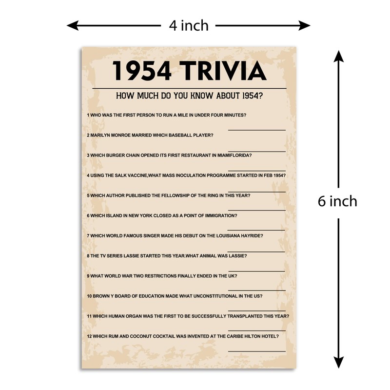 QUPT - Juegos de fiesta de cumpleaños 70, juegos de trivia de 1954, suministros para fiesta de cumpleaños para adultos, divertido juego de fiesta de 1954, paquete de 30 tarjetas
