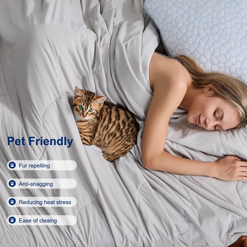 • Usage Tips: To ensure an optimal cooling experience, utilize the cooling comforter without additional covers and adjust your air conditioner to an energy-efficient setting of 78°F or below. The fabric of the cooling comforter naturally provides a cold sensation. However, prolonged coverage without movement may hinder its heat dissipation, thereby diminishing the overall cooling effect and initial chill. Thus, using the comforter in conjunction with an air conditioner or fan is recommended to sustain the refreshing cold feeling.