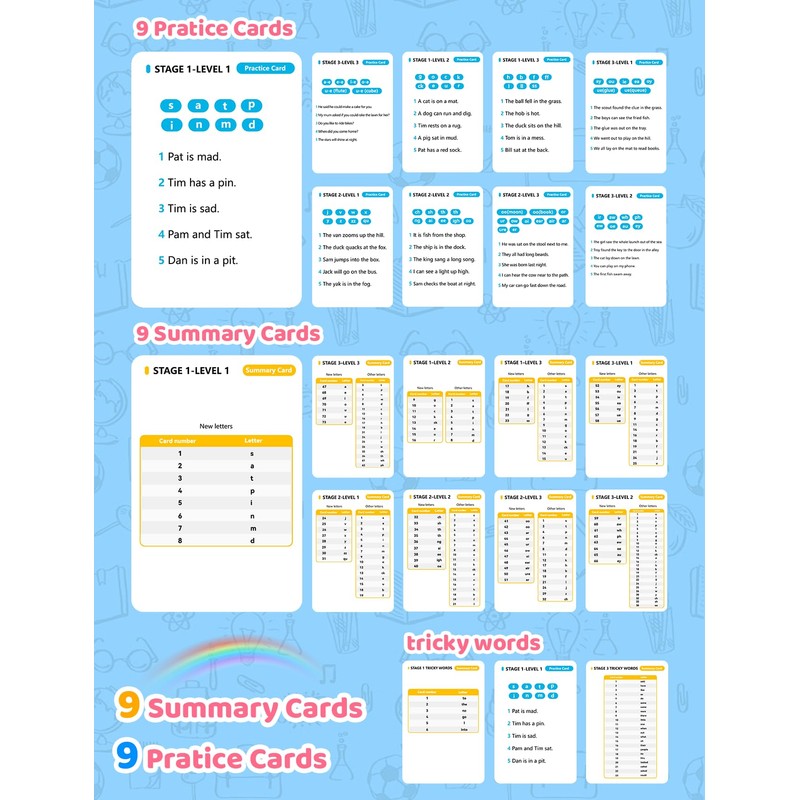 - [ Summary Cards & Practice Cards ] – Summary cards with an overview of the letters and letter combinations that feature within that level are included for each level. A practice card with 5 example sentences applying the words kids gained in each level is provided as well to improve the reading skills.