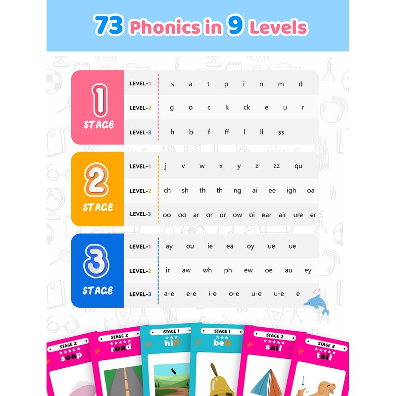- [ Systematic Mastering Their Phonics & Improve Reading Skills ] --- Developed by linguistic experts, this phonics system includes 73 letters or combinations cards in 9 levels and 265 words utilize the letters in each stage for practicing. This phonics flash cards system ensures a comprehensive understanding of phonics rules and word construction. Great learning toys for toddlers 3+.