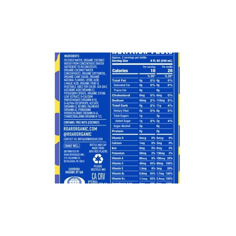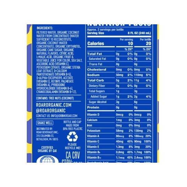 - Roar provides hydration with coconut water, electrolytes, Vitamins B5, B6, B12, A, C, E, and antioxidants from Vitamins A, C, and E