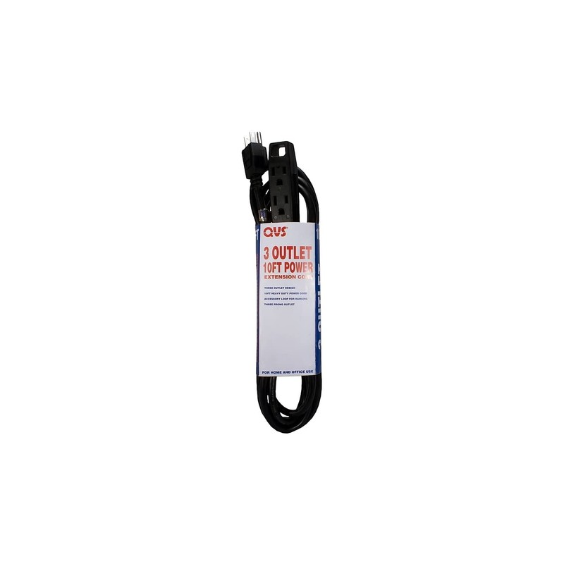 The 25', Black QVS 3-Outlet 3-prong power extension cord has three outlets and is rated at a maximum of 1625W at 125V, making it suitable for connecting your computers, peripherals, and other office equipment to it. The power strip draws 13a of current through its 16-gauge cord and is ETL-listed.