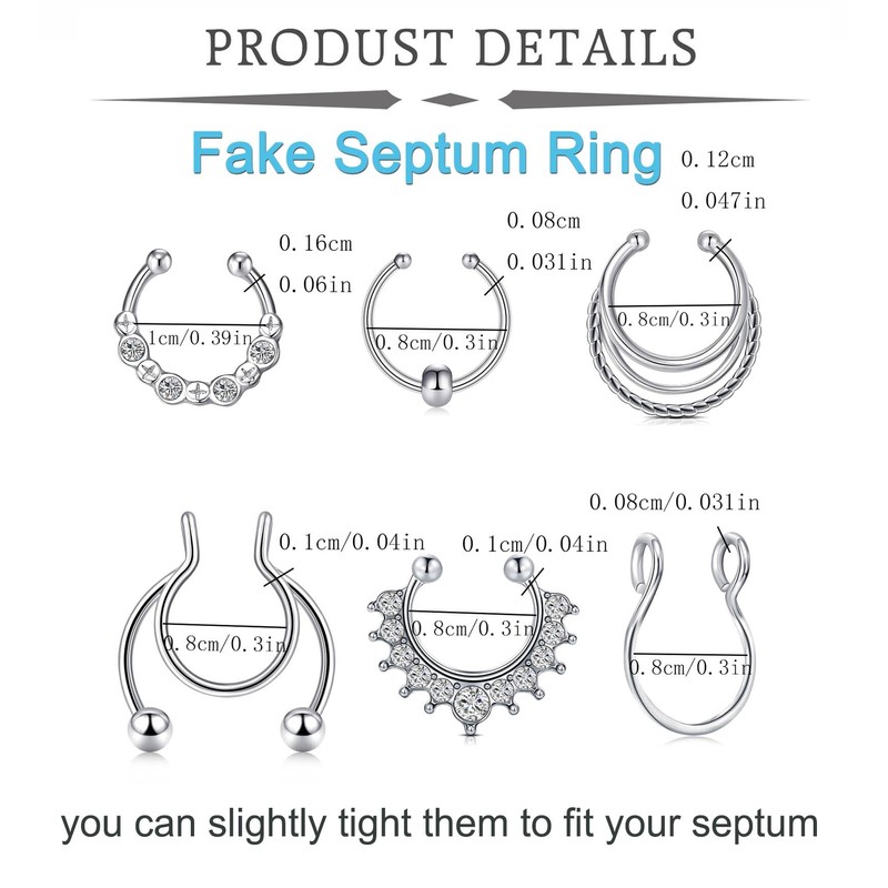 - Order include - 6pcs different styles of fake septum rings fake septum piercing faux septum nose rings